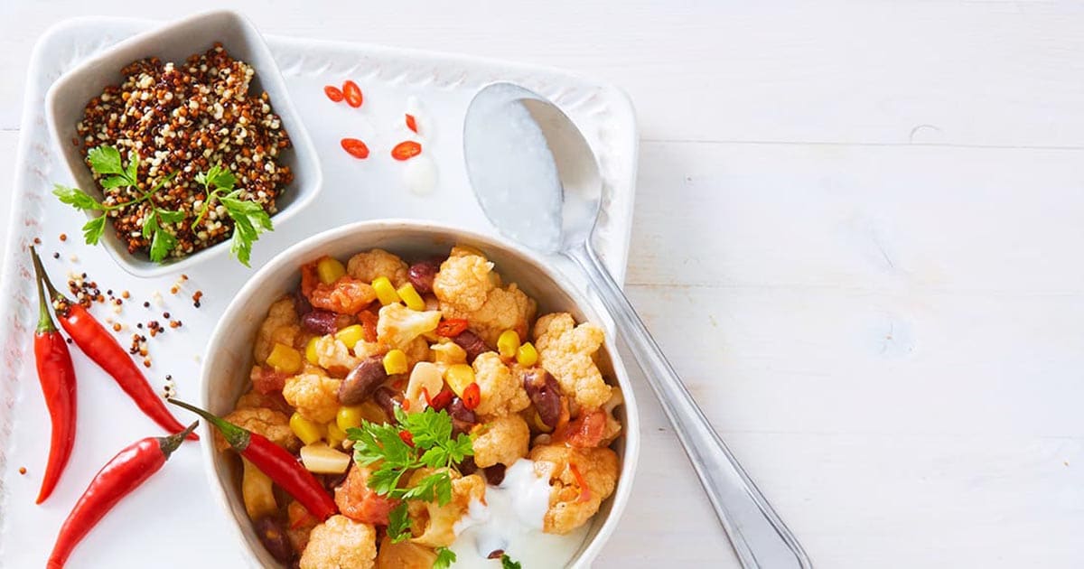 Blumenkohlröschen mit Knoblauch und Chili in erhitztem Öl ca. 3 Minuten andünsten. Mit Brühe und stückigen Tomaten ablöschen, Kidneybohnen mit Mais zum Chili geben und ca. 7 Minuten köcheln lassen.