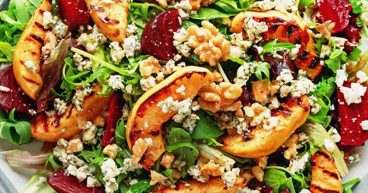 Variieren Sie diesen bunten Salat mit saisonalem Obst und Gemüse ganz nach Ihrem Geschmack: Die herbstliche Ernte hat neben den Klassikern wie Kürbis, Feldsalat und Roter Bete auch regionale Genüsse wie Blumenkohl, Spinat und Mais zu bieten.