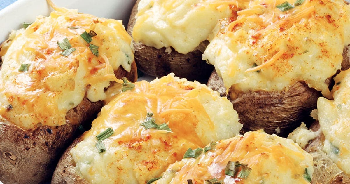 Die Masse auf die Kartoffeln verteilen. Mozzarella in dünne Scheiben schneiden, die gefüllten Kartoffelhälften damit belegen und im vorgeheizten Backofen 10 Min. bei 180° C (Umluft 160° C) garen.