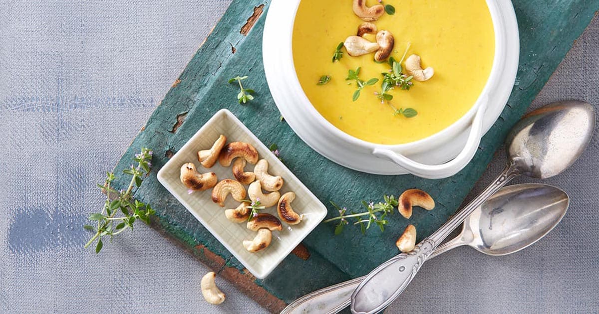 Suppe pürieren, mit Salz, Pfeffer, Kreuzkümmel und Hefeflocken würzen und mit Zitronenthymian verfeinern. Kürbis-Zitronenthymian-Suppe mit Cashewkernen bestreut servieren.