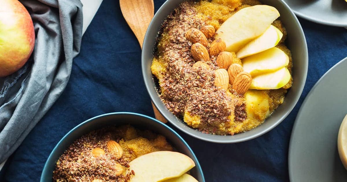 Hirse ist als Grundlage dieses leuchtend gelben Frühstücksrezeptes besonders bekömmlich und kann durch ihren hohen Silizium-Gehalt ganz nebenbei auch den Wiederaufbau körpereigener Zellen unterstützen. Daneben tragen vor allem die immungesunden Zutaten Ingwer, Zimt und Kurkuma zu einem antientzündlichen Start in den Tag bei.
