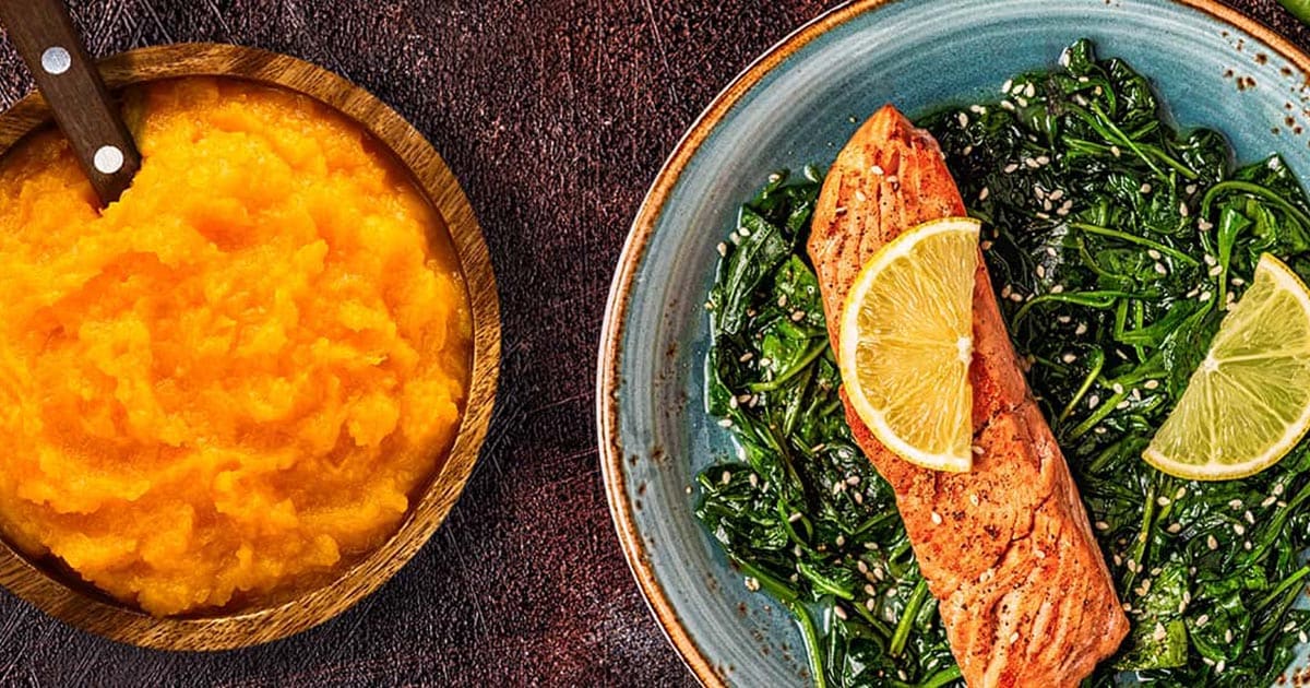 Lachs liefert hochwertiges Eiweiß sowie Omega-3-Fettsäuren. Möhren enthalten außerdem Beta-Carotin, eine Vorstufe von Vitamin A. Dieses Vitamin hilft Netzhaut und Linse sich vor freien Radikalen zu schützen.
