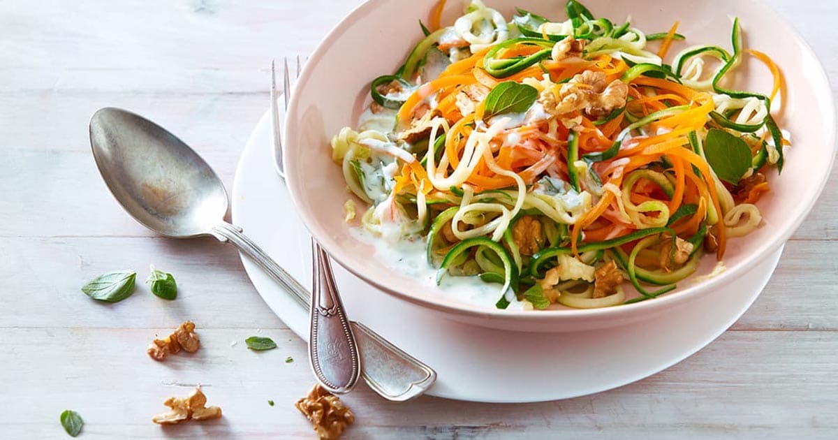 Sie haben keinen Spiralschneider? Dann nutzen Sie den Sparschäler für breitere Nudeln. Sie können auch Rote Bete, Süßkartoffeln oder Pastinaken für die Gemüsenudeln nutzen.