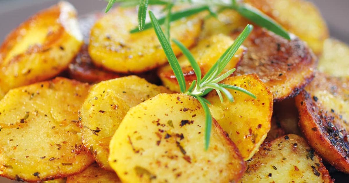 Die Kartoffeln in Scheiben schneiden. Die Gewürze und das Olivenöl verrühren, mit etwas Salz und Pfeffer abschmecken. Die Marinade zusammen mit den Kartoffeln in eine Schüssel mit Deckel geben.