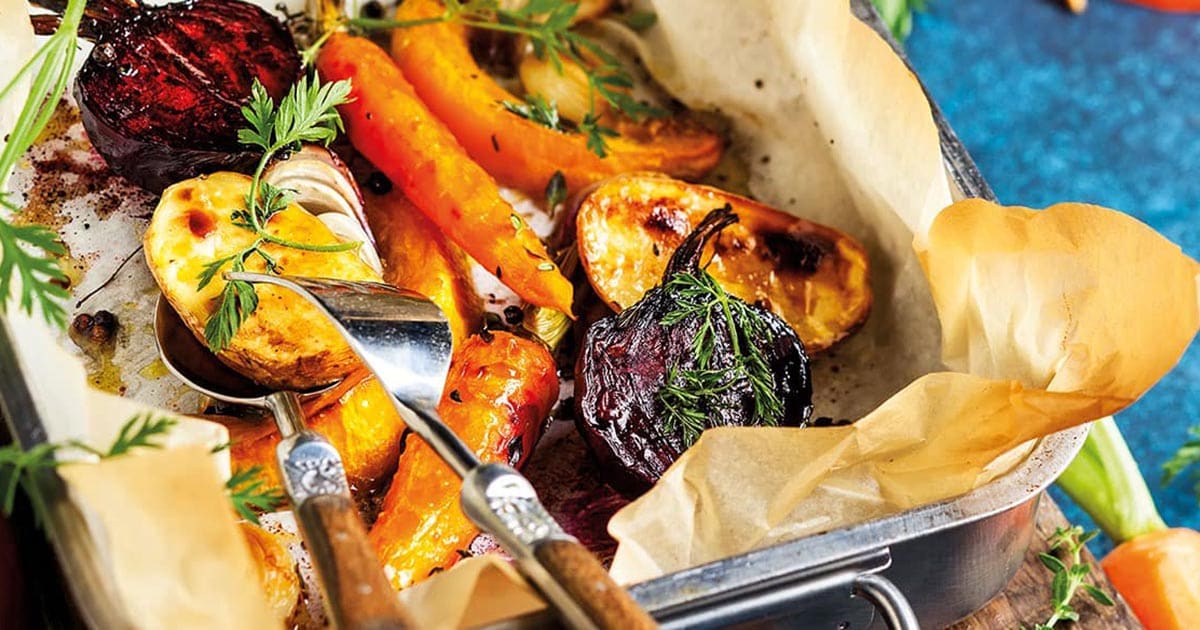 Das Gemüse auf das Papier verteilen. Auf jedes Päckchen einen Zweig der frischen Kräuter (z. B. Thymian, Oregano oder Rosmarin) verteilen. Die Päckchen zusammenfalten und gegebenenfalls mit Küchengarn verschließen.
